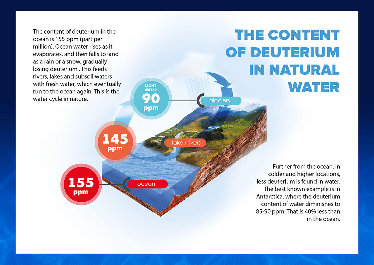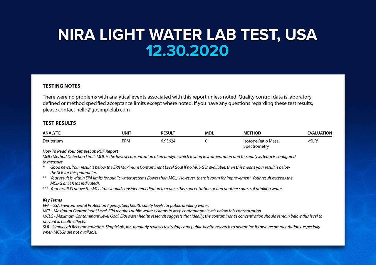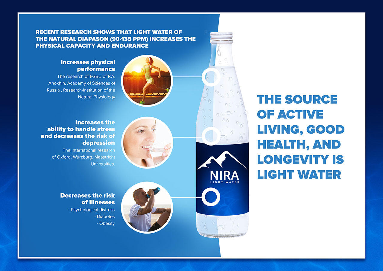 Nira Light Water has access to a patented water purification technology that allows us to remove “heavy” hydrogen (deuterium) and create a water that is “lighter” than the water that people drink every day.By comparison, the deuterium content of natural rivers and lakes is around 145 ppm; while mountain glaciers and ice in Antarctica is only 90ppm. Most bottled water is around 135 ppm. Nira light water matches mountain glaciers at 90 ppm after treatment. In fact, our production technology allows us to purify water all the way down to a deuterium content of 2ppm.It has been established that “light” water has a positive effect on human health: it increases mental and physical performance, increases resistance to stress, helps with metabolic diseases (diabetes and cardiovascular diseases), delays cell aging, and increases life expectancy.The unique properties of "light" water have been confirmed by a number of studies. To date, more than 300 scientific studies have been published around the world by leading scientific institutions including: the Universities of Oxford, Würzburg, Maastricht, and the USA.