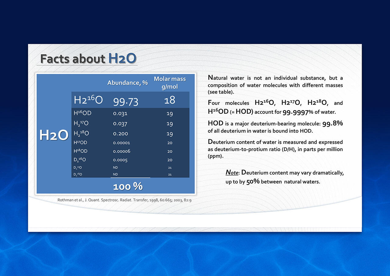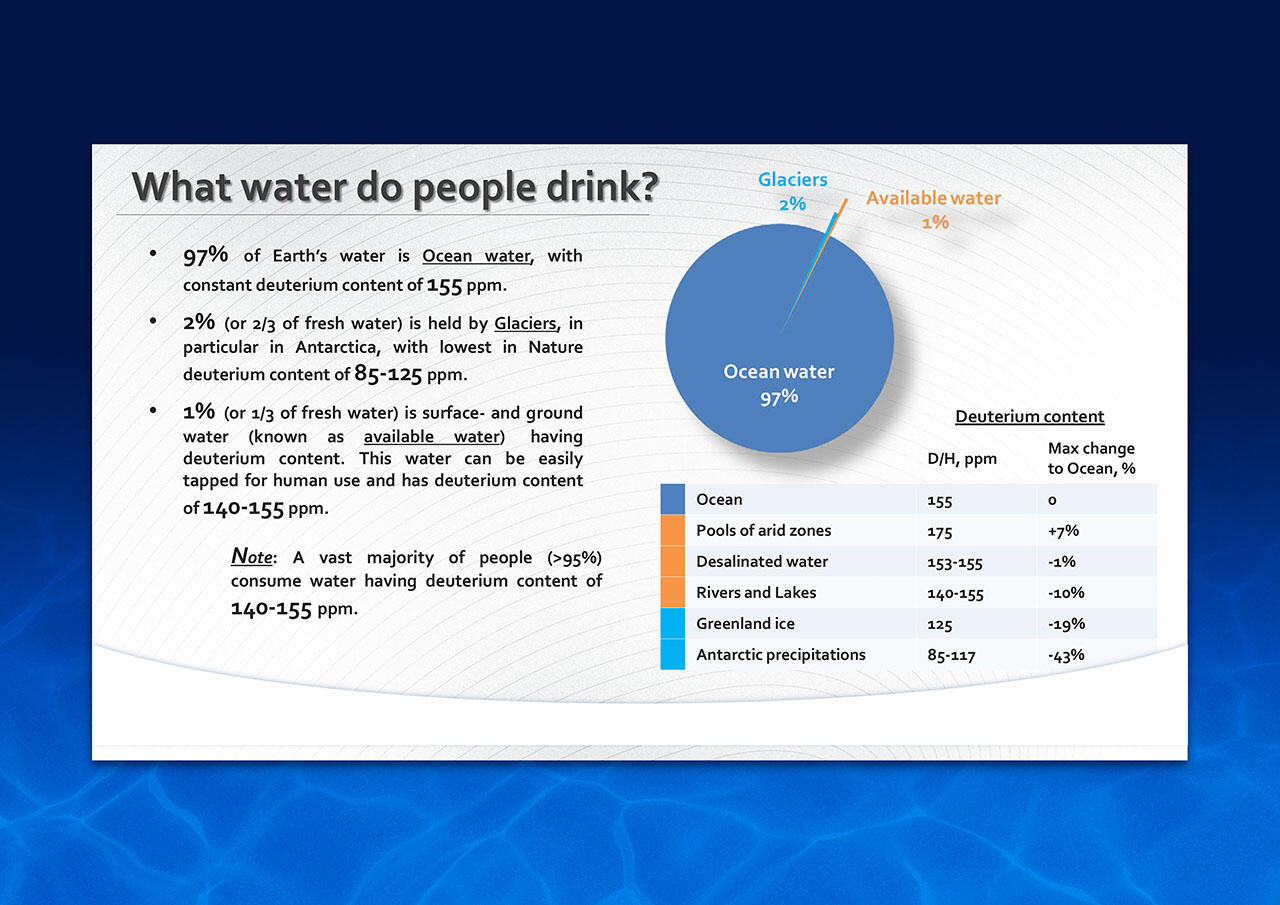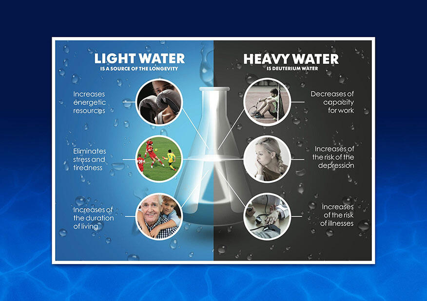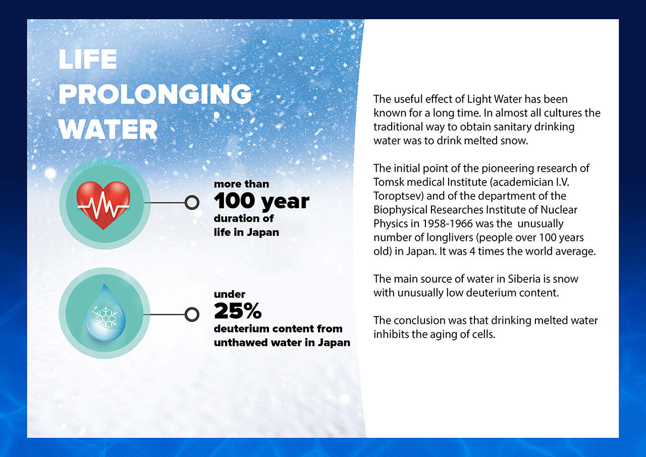 • The unique properties of "light" water have been confirmed by a number of studies. To date, more than 300 scientific studies have been published in the world, carried out by leading scientific institutions of the world, including: the Universities of Oxford, WUrzburg, Maastricht, as well as the institutes of the Russian Academy of Sciences.• It is known that natural water is a heterogeneous substance in its isotopic composition. In addition to the molecules of light (protium) water - H2O16, consisting of two hydrogen atoms (protium) and one oxygen atom - 16, natural water contains 7 more stable isotopic modifications. The total amount of heavy isotopes in natural water is N 0.272%. At the same time, the main agent causing negative effects is deuterium oxide.• It has been established that "light" water has a positive effect on human health: it increases mental and physical performance, increases resistance to stress, helps with metabolic diseases (diabetes and cardiovascular diseases), delays cell aging, and increases life expectancy.• The presence of heavy water (deuterium oxide) in any natural water, in contrast to light natural water, which is the source of life, can cause irreversible changes in the body of higher animals and humans. Purification of water from deuterium will dramatically improve its properties, turning water into a life stimulator.