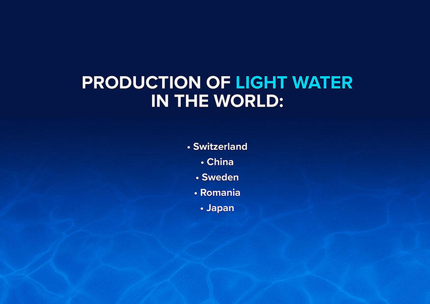 • The unique properties of "light" water have been confirmed by a number of studies. To date, more than 300 scientific studies have been published in the world, carried out by leading scientific institutions of the world, including: the Universities of Oxford, WUrzburg, Maastricht, as well as the institutes of the Russian Academy of Sciences.• It is known that natural water is a heterogeneous substance in its isotopic composition. In addition to the molecules of light (protium) water - H2O16, consisting of two hydrogen atoms (protium) and one oxygen atom - 16, natural water contains 7 more stable isotopic modifications. The total amount of heavy isotopes in natural water is N 0.272%. At the same time, the main agent causing negative effects is deuterium oxide.• It has been established that "light" water has a positive effect on human health: it increases mental and physical performance, increases resistance to stress, helps with metabolic diseases (diabetes and cardiovascular diseases), delays cell aging, and increases life expectancy.• The presence of heavy water (deuterium oxide) in any natural water, in contrast to light natural water, which is the source of life, can cause irreversible changes in the body of higher animals and humans. Purification of water from deuterium will dramatically improve its properties, turning water into a life stimulator.